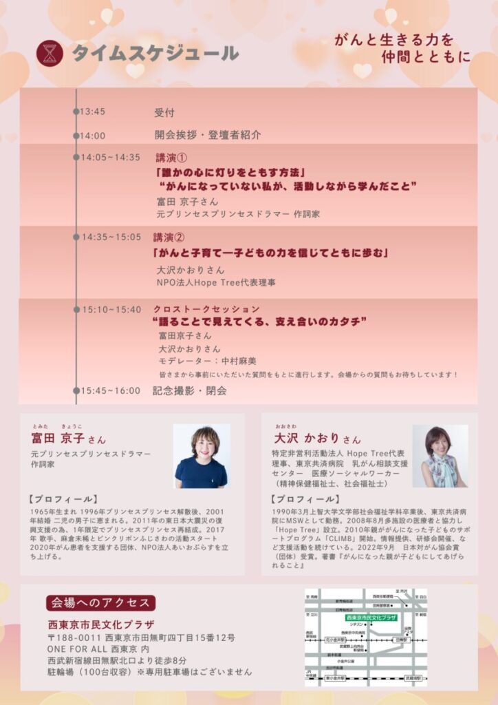 今回のイベントでは、子育て世代に向けて、地域で安心してがん治療と子育てを両立するために必要なことについて、元プリンセスプリンセス ドラマー・作詞家の富田京子さんとNPO法人Hope Tree 代表理事の大沢かおりさんとともに考えます。富田さんからはがんを経験していない立場だからこそ感じたこと、仲間との関わりを通じて気づいたことについて、大沢さんからは「がんの親を持つ子ども」の支援を通じて見えてきた、家族や子どもたちの思いなどについてお話しいただきます。