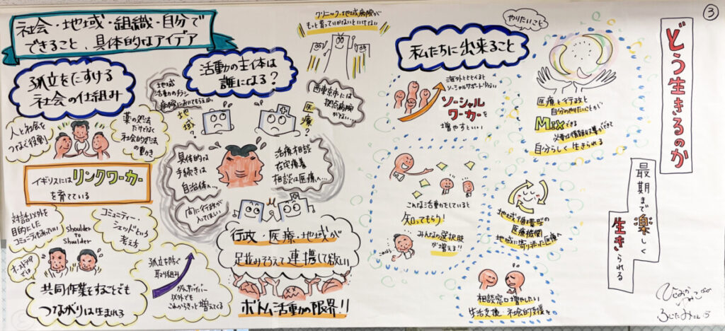 さらに印象的だったのが「グラフィックレコーディング」という手法です。議論の内容がその場で大きな紙に絵と言葉で描かれていき、対話の流れが一目で見える形になります。見ているだけでも楽しく、初めての体験でした。こんな感じです!