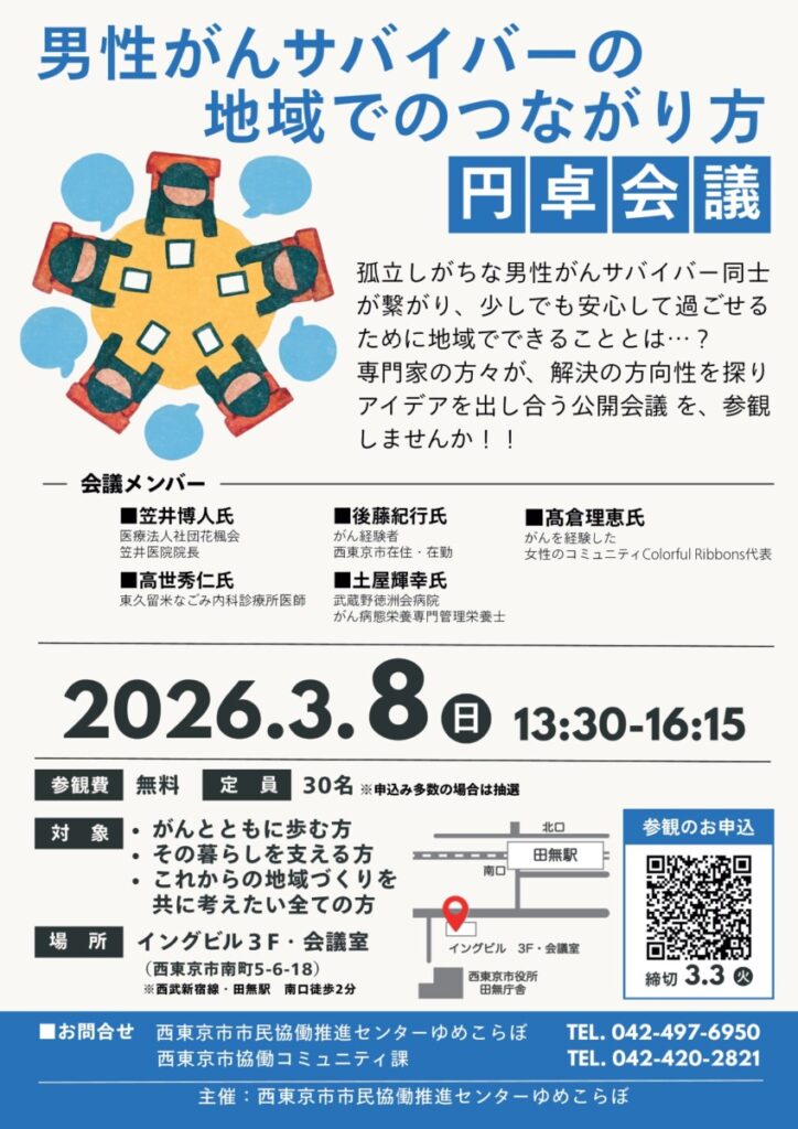 2026年3月8日(日)、西東京市で開催された円卓会議「男性がんサバイバーの地域でのつながり方」(主催:西東京市民協働推進センターゆめこらぼ)に参加させていただきました。